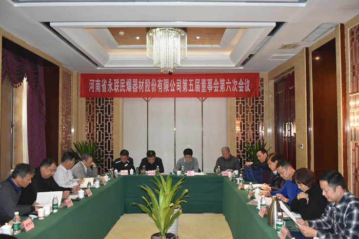 河南省永聯(lián)民爆器材股份有限公司第五屆董事會(huì)第六次會(huì)議于2020年1月9日在鄭州市鄭東新區(qū)福緣國(guó)際酒店召開(kāi)。會(huì)議應(yīng)到董事11人,實(shí)到董事9人;應(yīng)到監(jiān)事5人,實(shí)到監(jiān)事5人,符合《公司法》及公司《章程》的有關(guān)規(guī)定,會(huì)議有效。會(huì)議由董事長(zhǎng)劉嵩同志主持,董事會(huì)秘書(shū)王虎同志記錄。