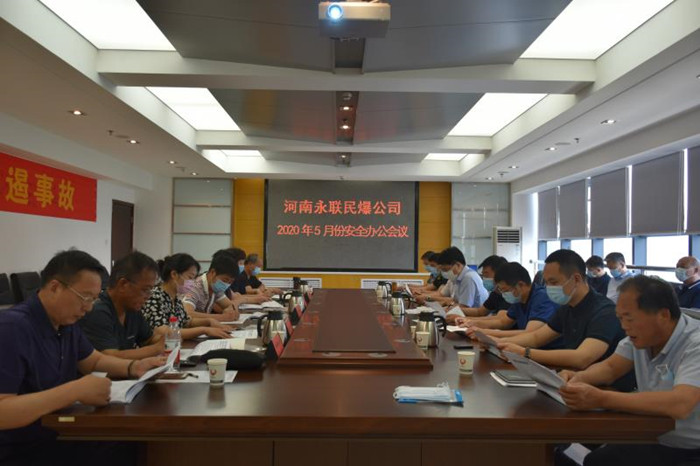 2020年5月28日,河南省永聯民爆器材股份有限公司召開了5月份安全辦公會議,公司領導班子、安委會成員、安委會辦公室成員以及嵩縣、桐柏、泌陽縣、義馬市、商城縣、信陽平橋等6家分公司負責人參加了會議。會議由公司副總經理靳義國主持,公司董事長、總經理劉嵩同志參加會議并講話。