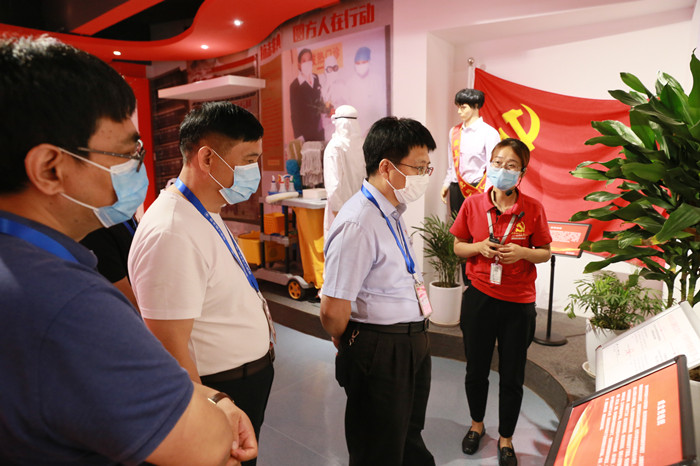 在圓方集團黨建培訓室,全體黨員干部體驗了唱國歌、亮身份、溫誓詞等主題黨課儀式,并觀看了黨建宣傳片《我的中國我的夢之“網紅薛書記”講黨課》。隨后,在圓方集團工作人員的詳細講解下,全體黨員干部參觀學習了圓方創業紀念館、圓方黨建紀念館、中國微黨史國史館、“抗疫情、戰新冠”展教館、網紅薛書記直播間、圓方“三會一課兩培訓”黨建文化長廊、圓方勞模星光大道和圓方先進工作者展示墻等。大家被圓方集團濃厚的黨建氛圍深深的吸引與打動,為薛書記引領下崗工人和農民工在平凡崗位創造不平凡人生而感動,被圓方集團共產黨員“平時看出來、困難站出來、危急豁出來”的宣言和行動所震撼,再次感受到了“黨建也是生產力”的深刻內涵。